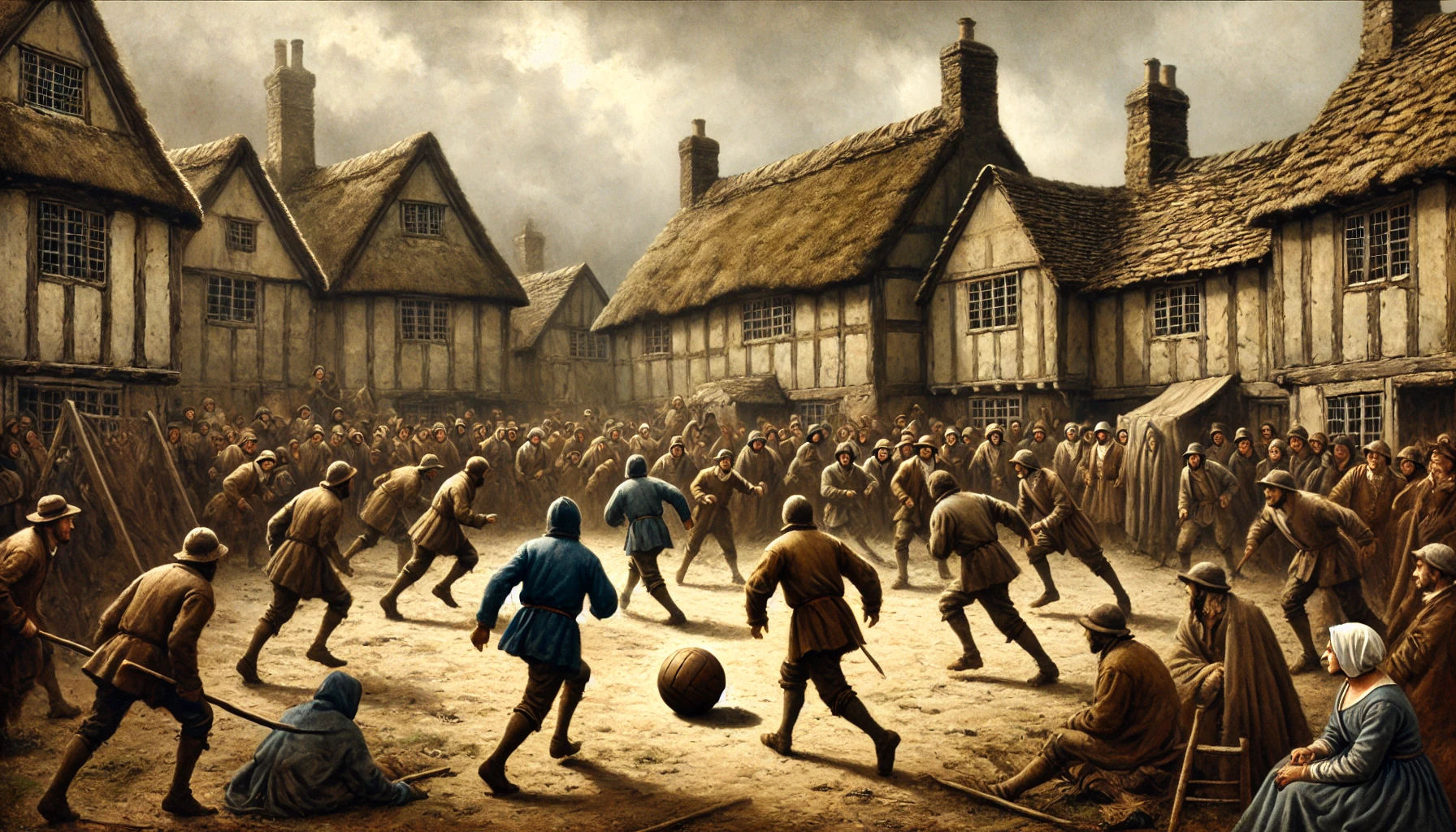 Nell’epoca preindustriale della Gran Bretagna, le partite si giocavano su grandi distese di terreno, tra villaggi, tra chiese, senza un campo da gioco definito – né nel senso che conosciamo oggi, né come nei giochi dell’antichità. La modalità di gioco, che assomiglia a una sorta di “guerra pacifica”, attirava soprattutto giovani uomini e adolescenti, poiché rappresentava una delle rare attività in grado di stimolare una tale scarica di adrenalina, senza però il rischio di morte che comportavano la guerra o altre occupazioni pericolose. Per esempio, il football medievale era certamente un’opzione più sicura rispetto ai duelli con la spada o ad altre forme di combattimento.